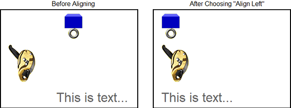 The Align Center and Align Middle commands function differently depending on whether you dragged your mouse to select multiple items or if you selected multiple items by pressing the Shift key and then clicking on the items. If you selected the items by dragging your mouse, these alignment commands will center the objects in the middle of all of the objects that are selected. If you select multiple objects using the Shift+Click technique, the objects will be aligned with the last item you selected. It may seem like a trivial detail, but it is a powerful tip for power users.