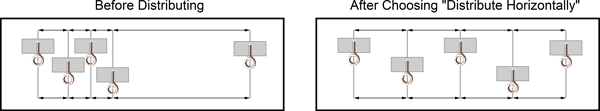 The following illustration shows five objects before and after using the Distribute Horizontally command.