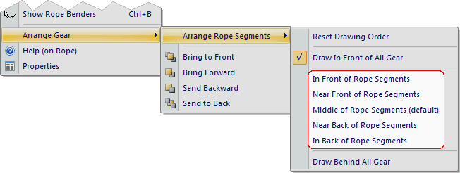 You can also right-click on an individual rope "segment" to display its shortcut menu, choose Arrange Gear, and then choose Arrange Rope Segments to select Draw in Front of All Gear or Draw Behind All Gear.