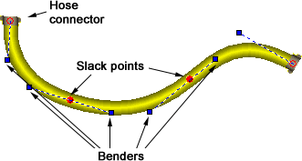 You can also add slack points to a hose by clicking on the workspace, typing "slack", pressing Enter, and then dragging and dropping the slack point on a hose. You can then drag the slack point's benders to add additional curves to the hose. Learn more about slack points.