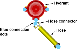 To connect hose to other fire equipment, use your mouse to drag a connector on the end of a hose, align the connector's blue connection dot with another connection dot, and drop the end of the hose. You can also drag other fire equipment (e.g., a hydrant), align its connection dot with the blue dot on the end of a hose, and drop it.