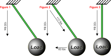Figure 4 shows an anchor supporting a 100-pound load. If you do not calculate horizontal forces, the anchor is holding 100 pounds. However, if you consider that the load is pulling down with 100 pounds and the hand is pulling to the right with 100 pounds, the net force on the anchor is closer to 141 pounds.