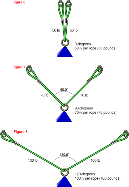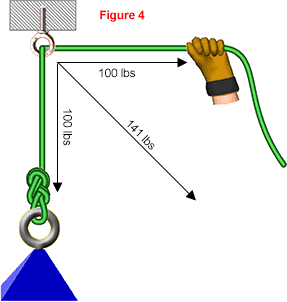 The angles in most rope systems have a relatively small impact on the forces. In Figure 4, the effect of the 90° angle increased the forces on the anchor from 100 pounds to 141 pounds which should be well within your safety factor. However, some rope systems, particularly highlines and anchors, can be overloaded due to horizontal forces.