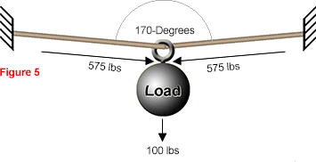 Figure 5 shows a highline with each rope at 85° (for a total of 170°). As in the preceding systems, Figure 5 has a 100-pound load. However, due to the angle of the rope, this 100-pound load applies almost 575 pounds of force to each of the anchors. If the load was a more realistic rescue load of 500 pounds, the ropes and anchors would receive a dangerous 2,800 pounds of force.