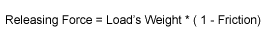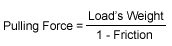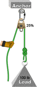 The pulley in the example to the right has 25% friction and the load weighs 100 pounds. Using the above formulas, if the hand is pulling, the force on the hand will be 133 pounds (100 divided by 0.75); if the hand is releasing rope, the force on the hand will be 75 pounds (100 multiplied by 0.75).