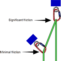 As shown in the illustration to the right, the friction generated on a rope is a function of the angle that the rope enters and exists the item. If a rope is barely deflected by a carabiner, it does not generate much friction. If it turns 180° around the biner, it creates significant friction. vRigger does not make this distinction.