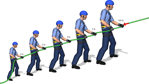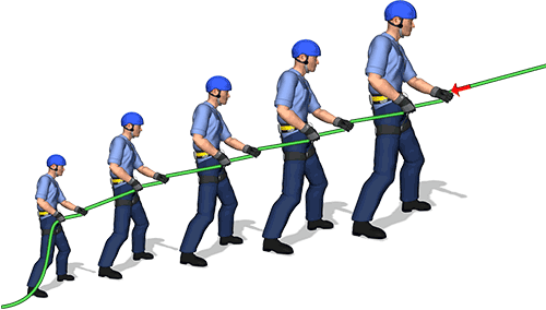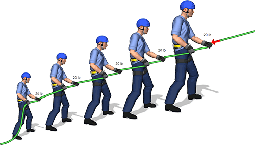 However, you can select all but one of the items that can pull and release rope and set the Direction field in the properties pane to Holding. Doing so will instruct vRigger to ignore those items when determining the number of items that can pull or release rope. In the following system, only the rightmost man is pulling—the others are holding the rope.