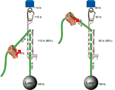 In the following system, note how the force on the anchor changes when the hand is above the brake bar rack versus when it is below the rack. On the system on the left, there are 110 pounds of force on the anchor; on the system on the right, there are 90 pounds on the anchor.
