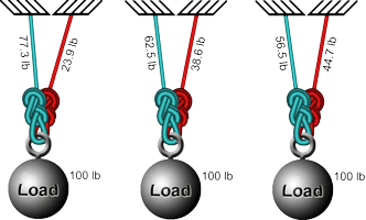 For example, it is clear in the following systems that the load's 100 pounds must be shared between the two anchors, but it isn't clear how much of the 100 pounds should be assigned to each of the anchors. (These systems all show a little more than 100 pounds on the anchors due to the rope angles.)