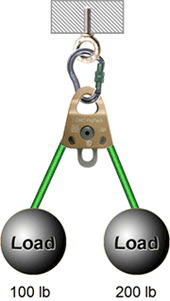 The system shown below is unbalanced because one of the loads weighs 100 lb and the other weighs 200 lb. In the real world, the 200 lb load would move down and the 100 lb load would move up, until the 100 lb load hit the pulley.