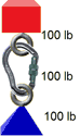 In the following illustration, it is obvious that the carabiner should display 100 lbs of force. The load is "pulling" down with 100 lbs of force and the anchor is "pulling" the carabiner up with 100 lbs of force. The 100 lbs displayed is the "tension" across the carabiner.