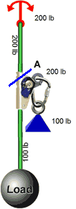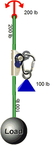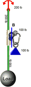 Now consider this next system. It contains a 100 lb load hanging on a rope and a second 100 lb load attached to the rope with an ascender. The net force on the anchor is obviously 200 lbs, but what force is on the ascender?