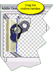 The blue lines in the above two illustrations show possible locations where the forces can be measured on the ascender (i.e., the "tension midline"). The tension midline is displayed on the Forces page of the Gear Builder when the Use default tension midline checkbox is unchecked. When this box is unchecked, you can drag the handles on the ends of the tension line.