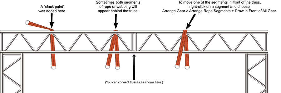 Webbing and rope segments are often displayed on the "wrong" side of the truss (i.e., with both segments either in front or behind the trust). As explained in the following illustration, you can right-click on a rope segment and choose to display it in front of, or behind, the truss.