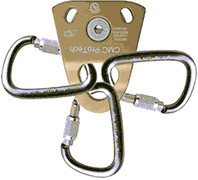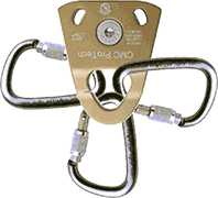 Similar to image fragmentation, occasionally gear might not appear connected. This almost always occurs when multiple pieces of gear connect very close to each other at different angles. For example, when three carabiners are connected into a single eye on a pulley. Fortunately, this is a rare situation. Unfortunately, there isn't an easy solution. Sometimes you can rotate gear slightly or change the gear drawing order. For example, the following shows the default appearance of three carabiners connected to a pulley. Although all three carabiners are connected to the pulley, only one looks like it is connected.