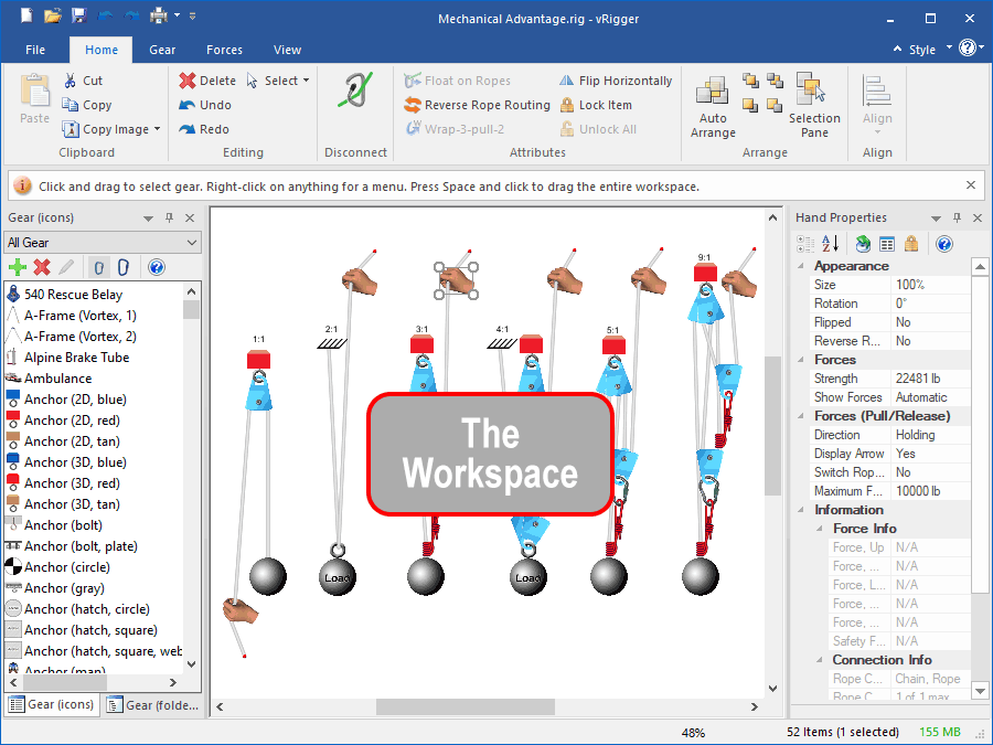 The area in vRigger where you build your rigging systems is called the "workspace." (Learn how to add gear to the workspace.)