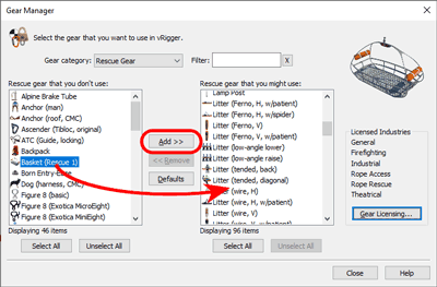 Note that some of vRigger's gear is only available if you own the "optional gear kit." This gear is displayed in gray text in the Gear Manager's "gear that you don't use" list and cannot be moved to the "gear that you might use" list. Click the Gear Licensing button in the Gear Manager to learn how to purchase the optional gear kit.