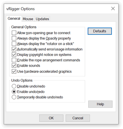 The General page in the vRigger Options dialog allows you to change various program preferences. To reset the options to their default values, click the Defaults button.