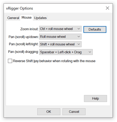 The Mouse page in the vRigger Options dialog allows you to specify the mouse behaviors that invoke various vRigger commands. To reset the options to their default values, click the Defaults button.