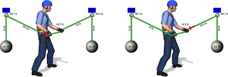 The Switch Rope Segment setting instructs vRigger to pull/release the other rope segment that is connected to the selected item. In the illustration on the left, the man is pulling on the rope segment that is behind him. In the illustration on the right, the Switch Rope Segment property was used to pull on the rope segment that is in front of him. You can see that the forces on the rope segments vary based on the direction the rope is moving due to friction.