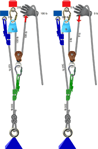Consider the following two systems. In the 3:1 system on the left, the hand is pulling the load and is therefore holding one-third of the load (i.e., 100 pounds). In the identical system on the right, the hand is releasing rope, the Prusik is holding all of the load, and the hand is holding 0 pounds.