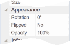 The Default Size and Rotation command at the top of the properties pane (and in the gear's shortcut menu) resets the size, rotation, and opacity of the selected gear: