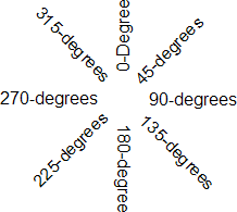 Rotated gear is based on 360 degrees with 0° at the top (12:00), 90° on the right (3:00), 180° at the bottom (6:00), and 270° on the left (9:00).
