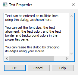 button in the properties pane to display the Text Properties dialog. When editing text within the properties pane, type "\n" to create a new line. For example, "this will\nappear on\nthree lines" will appear on three lines.